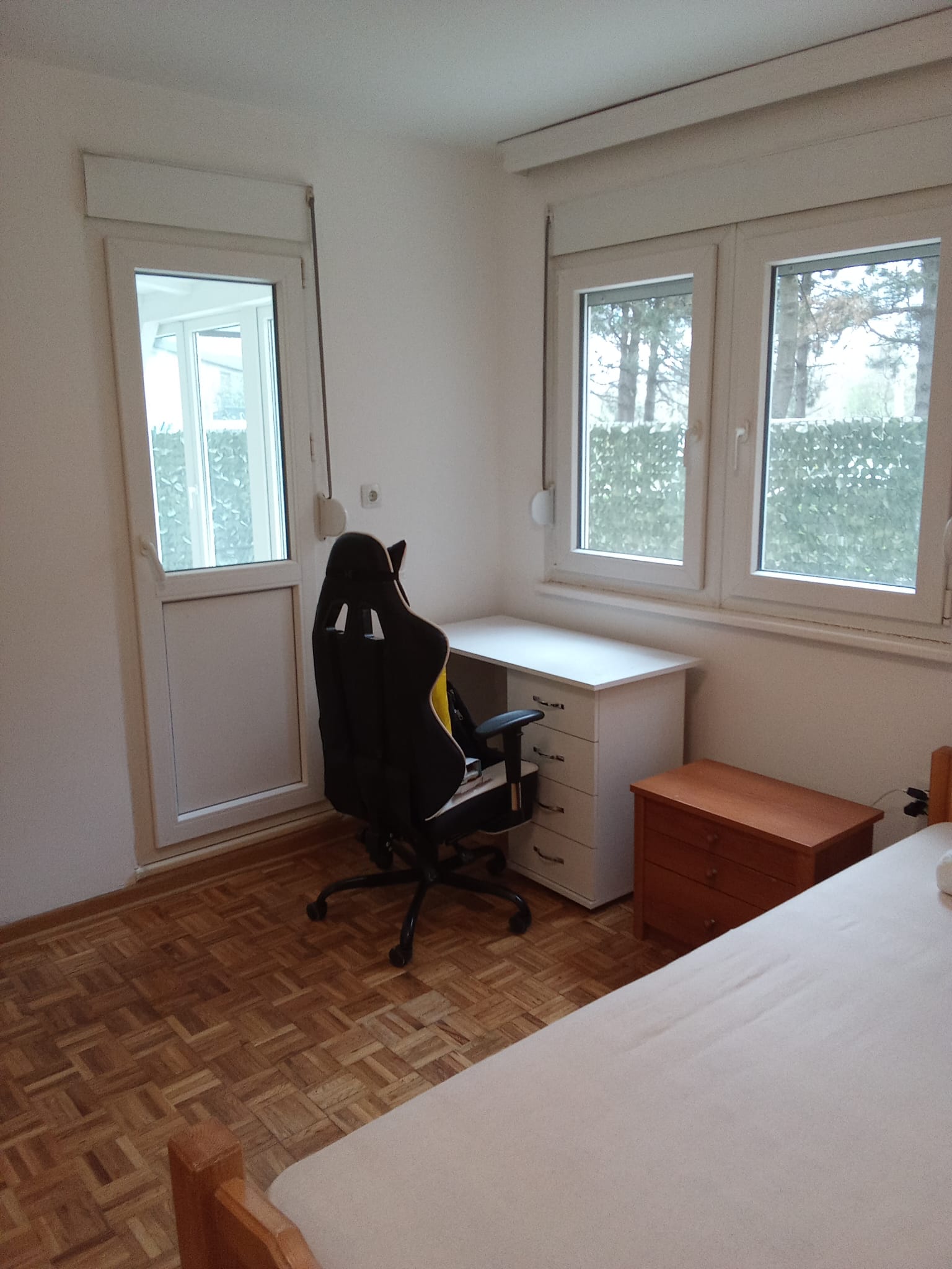 The modern building from 1995 with a large public parking shaded with trees for unlimited cars. Hence can serve as a business space, co-working office. Two empty parking spaces next to the building for disabled wheelchair users are situated next to ramp, no step or gap to cross. The apartment is located on the high ground floor, elevated 1 metre in relation to the terrain. Rooms oriented on cooling North, with kid’s room and kitchen on South. Venetian mirror windows with blinds. Two exits from rooms to terrace, from which there is an exit by steps to garden lawn on the ground level. The terrace is walled 50cm and fenced 100 cm up. Completely renovated, replaced electrical and plumbing installations, PVC interior and exterior carpentry, quality brand name bathroom and toilet, parquet planed and varnished. Air conditioning inverter unit with heater. Bright and sunny, freshly white painted, fully furnished and fully equipped on 113 m2, with 84m2 registered, 7m2 roofed terrace (extends from the sitting room, a second salon or office working space), 19m2 unroofed terrace, 3 m2 additional entrance hall incorporated from unused public space. By the owner. Infostan 12500dinars. With the planned connection to municipal gas, already on a waiting list for a governmental financial grand, heating bill will be according to individual use, fraction of present charges. Yearly property tax is only 12 000 dinars