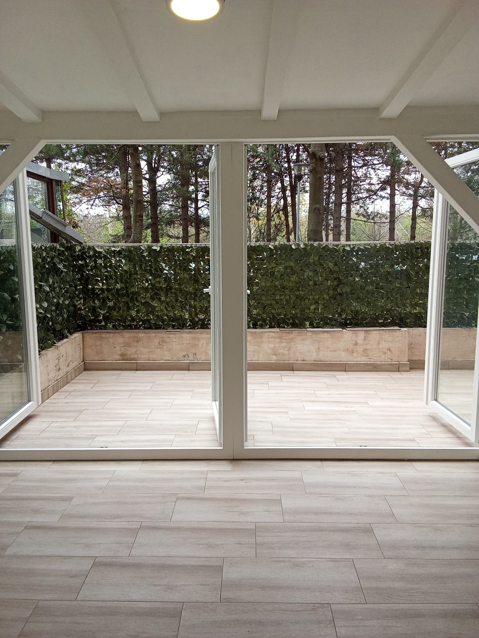 Apartment is 257 cm high and consists of: – kitchen 7 m2 enclosed by glass door, fully equipped with 200 litres fridge-freezer and 2 m2 shelved pantry. – bathroom 4m2 with 7kg washing machine, – living room 18 m2 with double doors to glassed winter house, – dining room 7 m2 with table for up to 8, connecting to all other rooms, – large terrace of 26 m˛ with 7 m2 glass winter house, – toilet 1.40 m2 with a sink and wall cupboard with mirror, – entrance hall 7 m2 with metal door with 2 high security safety locks, intercom. Security cameras at house entrance, corridors. – green secluded courtyard with roofed private space 12 m2 for barbecue, charging wheelchair, scooter or quod, children playground. Accessible by gate.